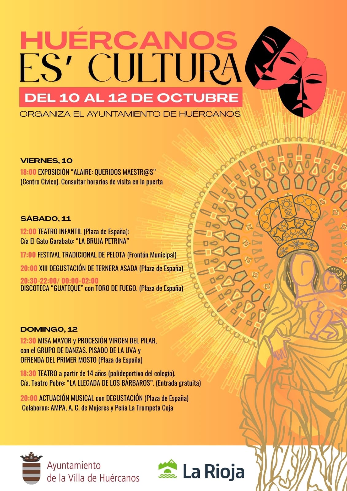 - 12:30h: Misa Mayor y Procesión Virgen del Pilar, con el Grupo de Danzas. Pisado de la uva y Ofrenda del Primer Mosto (Plaza de España)